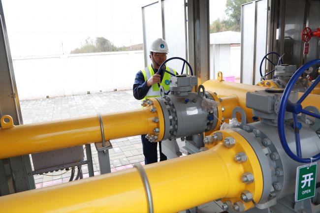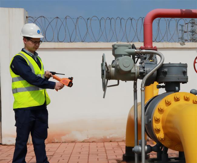 12時(shí)08分,置換作業(yè)開始。確定管道內(nèi)氣體成分比例符合要求后,置換組緩慢開啟1號(hào)閥門,向管網(wǎng)內(nèi)輸送天然氣,并由調(diào)度中心對(duì)管網(wǎng)內(nèi)壓力情況跟進(jìn)、監(jiān)測(cè)。正午時(shí)分,驕陽(yáng)似火,檢測(cè)人員們一邊吃著盒飯一邊堅(jiān)守施工現(xiàn)場(chǎng)觀測(cè)數(shù)據(jù)。終于,14時(shí)16分,現(xiàn)場(chǎng)調(diào)度的對(duì)講機(jī)內(nèi)傳來放散塔檢測(cè)人員的聲音:“經(jīng)檢測(cè),管網(wǎng)內(nèi)燃?xì)夂恳堰_(dá)99.7%,置換合格?!?