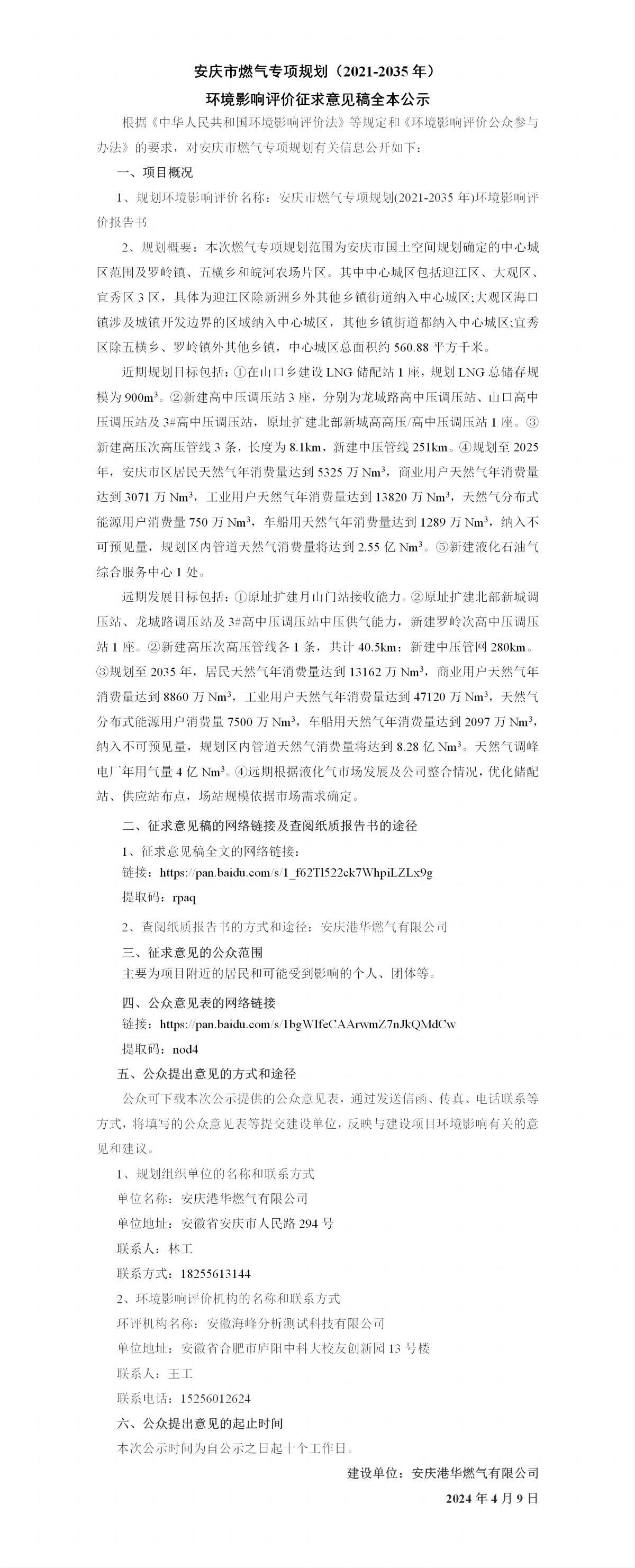 安慶市燃?xì)鈱m椧?guī)劃(2021-2035年)環(huán)境影響評價征求意見稿全本公示