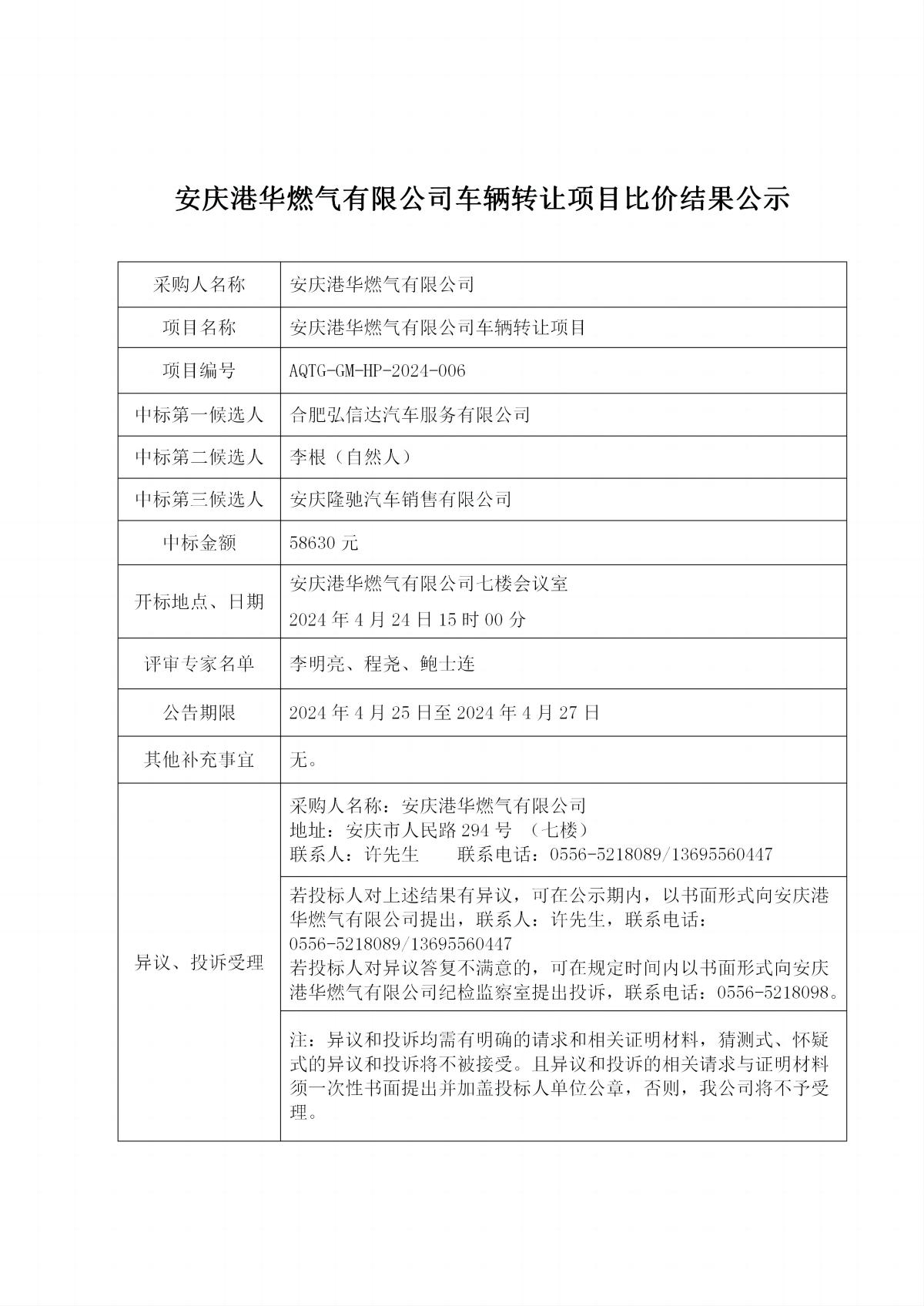 安慶港華燃?xì)庥邢薰拒囕v轉(zhuǎn)讓項(xiàng)目比價(jià)結(jié)果公示