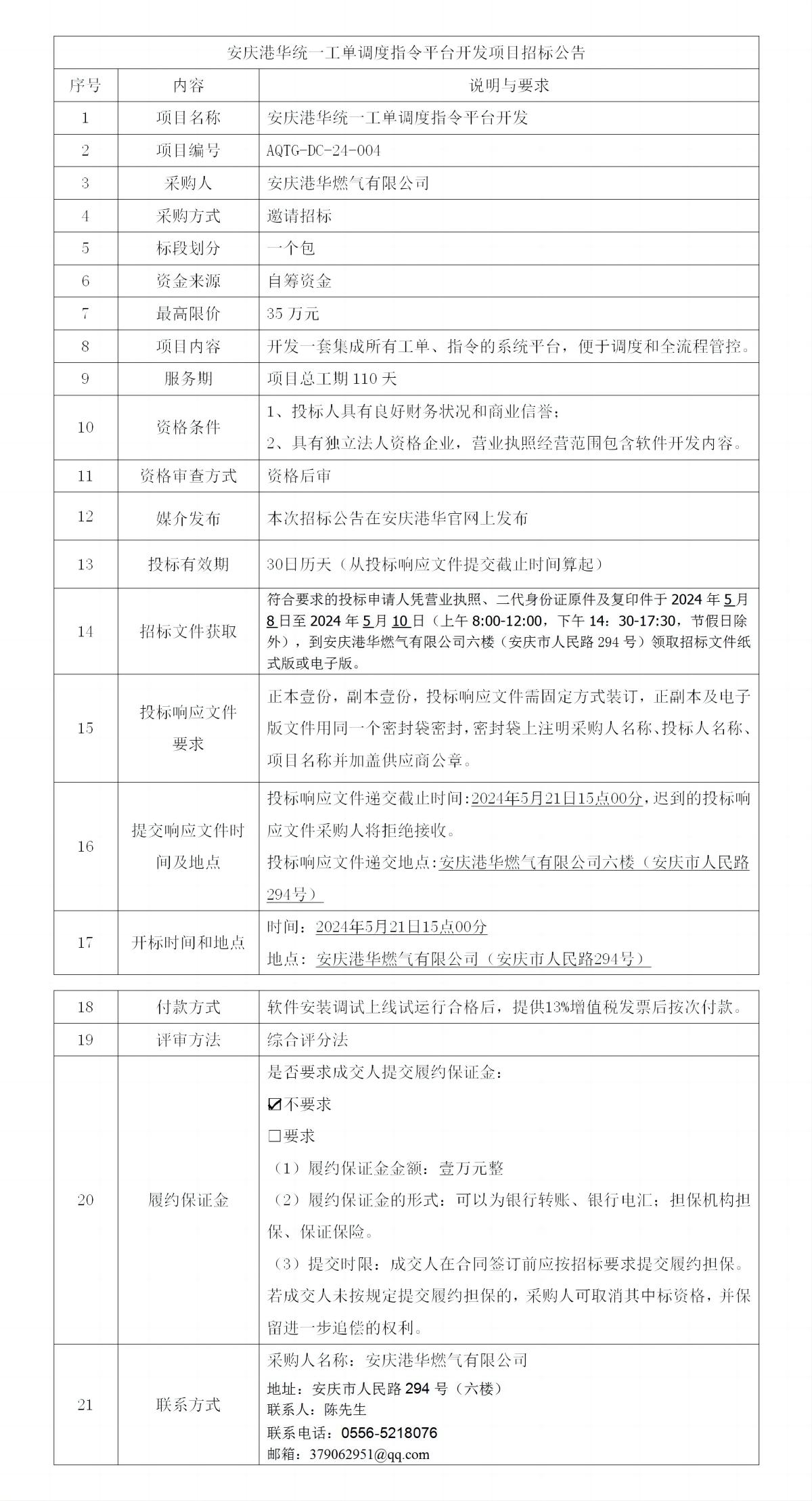 安慶港華統(tǒng)一工單調(diào)度指令平臺開發(fā)項目招標(biāo)公告