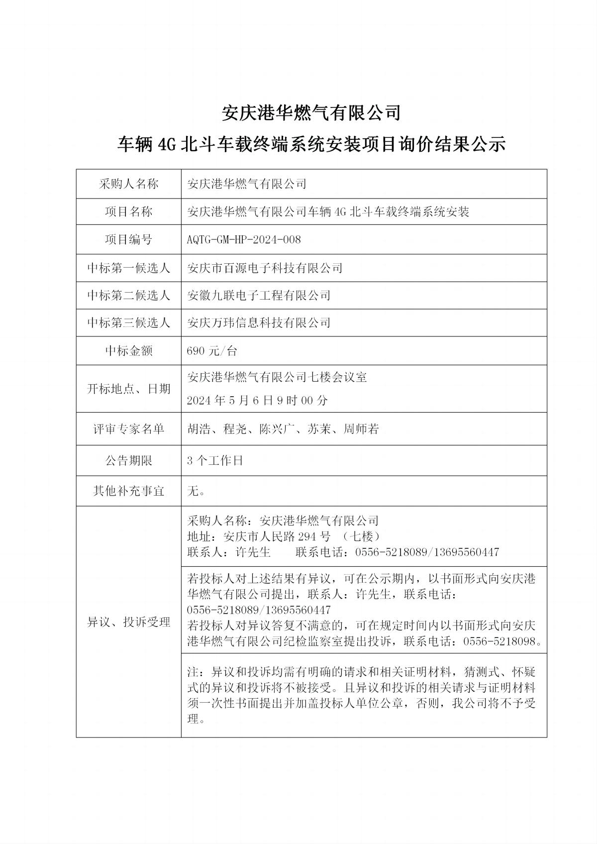 安慶港華燃氣有限公司車輛4G北斗車載終端系統(tǒng)安裝項目詢價中標公示