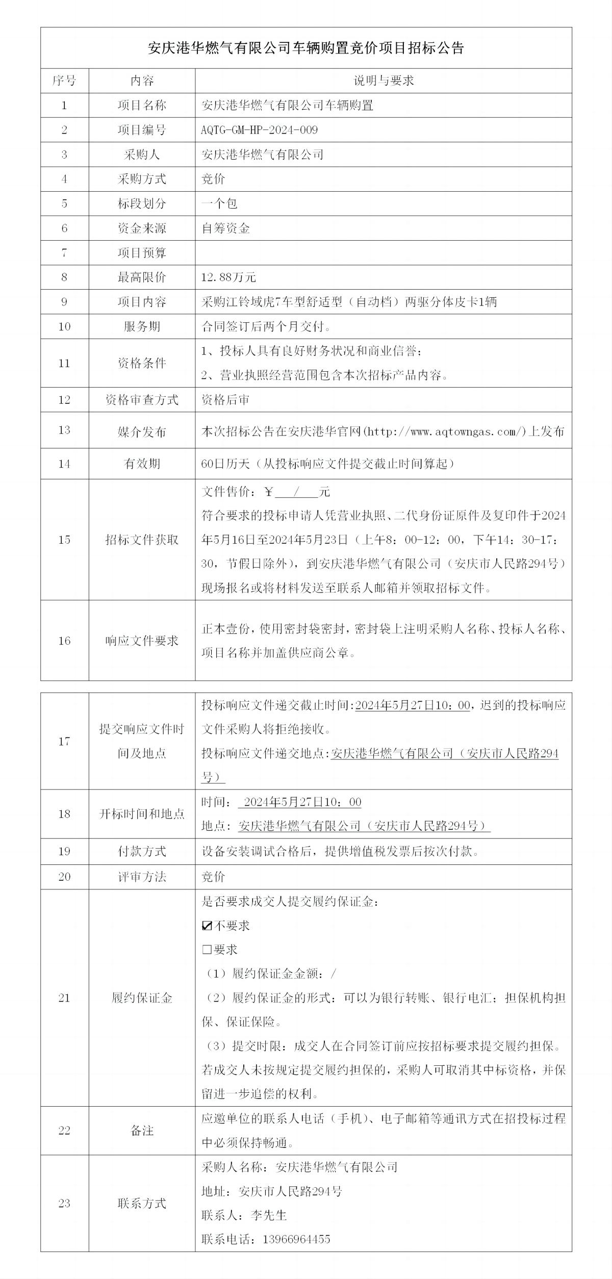安慶港華燃?xì)庥邢薰拒囕v購置競價項目招標(biāo)公告