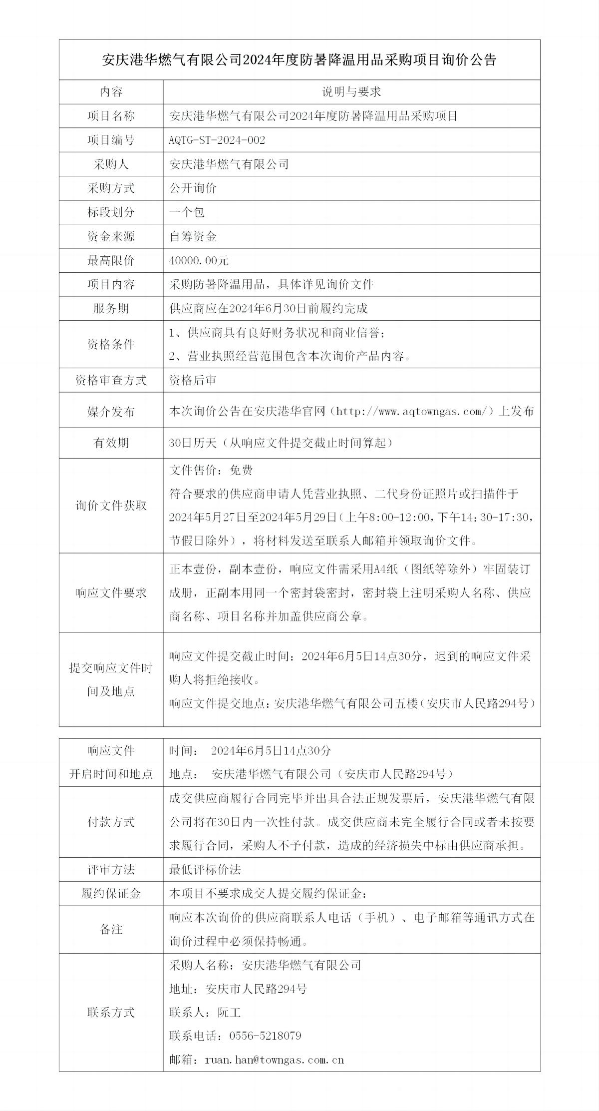 安慶港華燃?xì)庥邢薰?024年度防暑降溫用品采購項目詢價公告