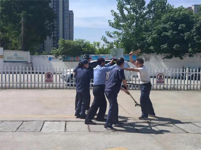 演練模擬了一起發(fā)生在加氣站的歹徒持刀威脅加氣工作人員的惡性事件。站內(nèi)員工發(fā)現(xiàn)嫌疑人員后,手持盾牌及警棍立即上前阻攔,其他人員及時(shí)配合并撥打轄區(qū)民警電話報(bào)警,站內(nèi)員工利用警棍、鋼叉等防衛(wèi)武器配合到達(dá)現(xiàn)場的民警將歹徒制服。