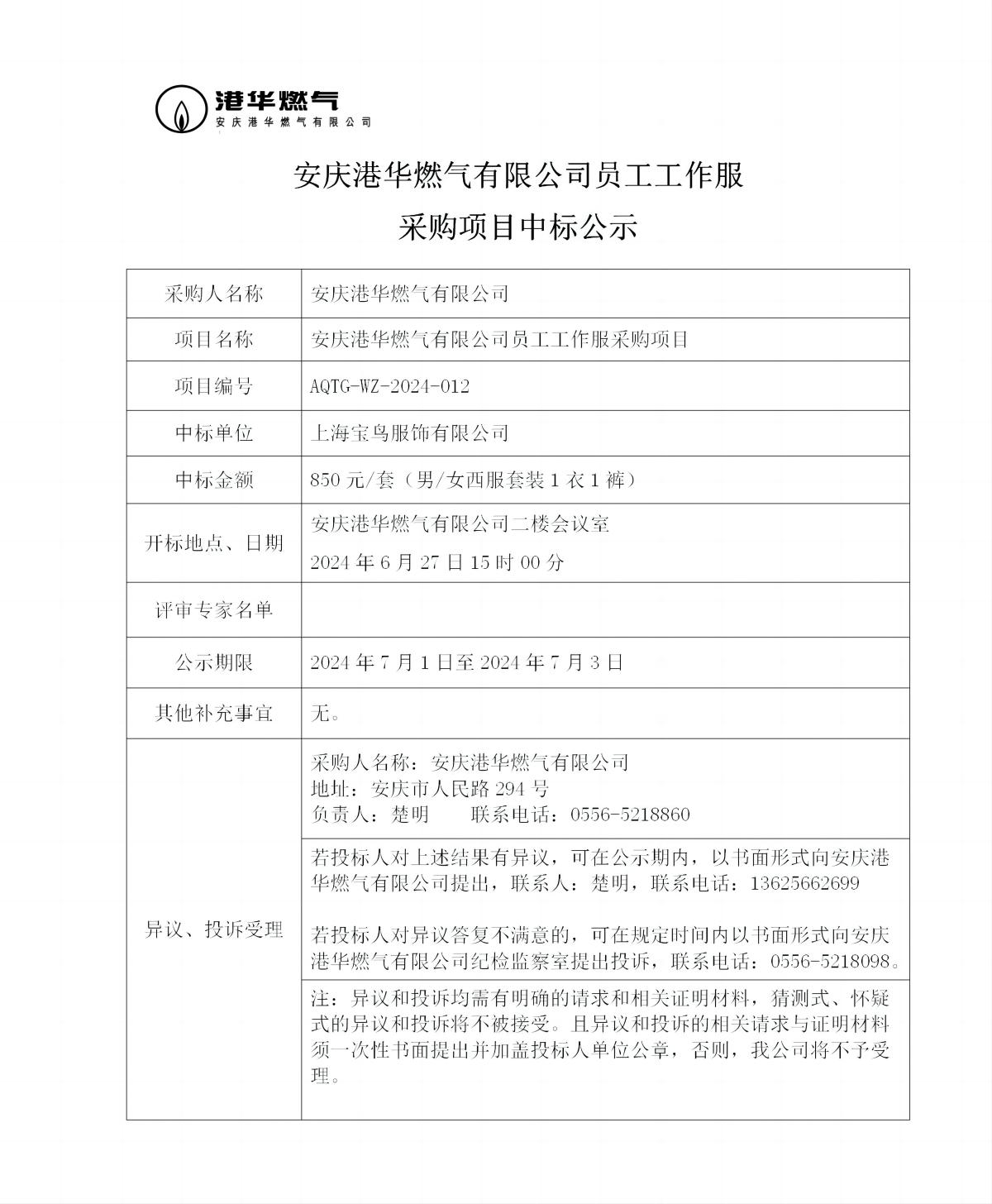 安慶港華燃?xì)庥邢薰締T工工作服采購(gòu)項(xiàng)目中標(biāo)公示