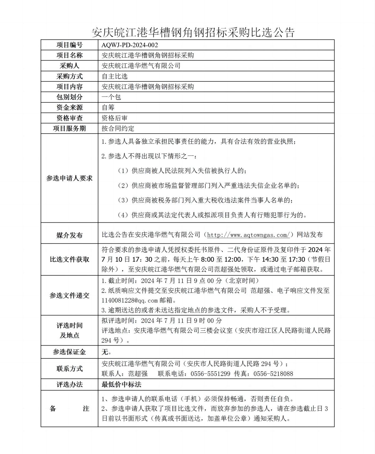 安慶皖江港華槽鋼角鋼招標(biāo)采購(gòu)比選公告