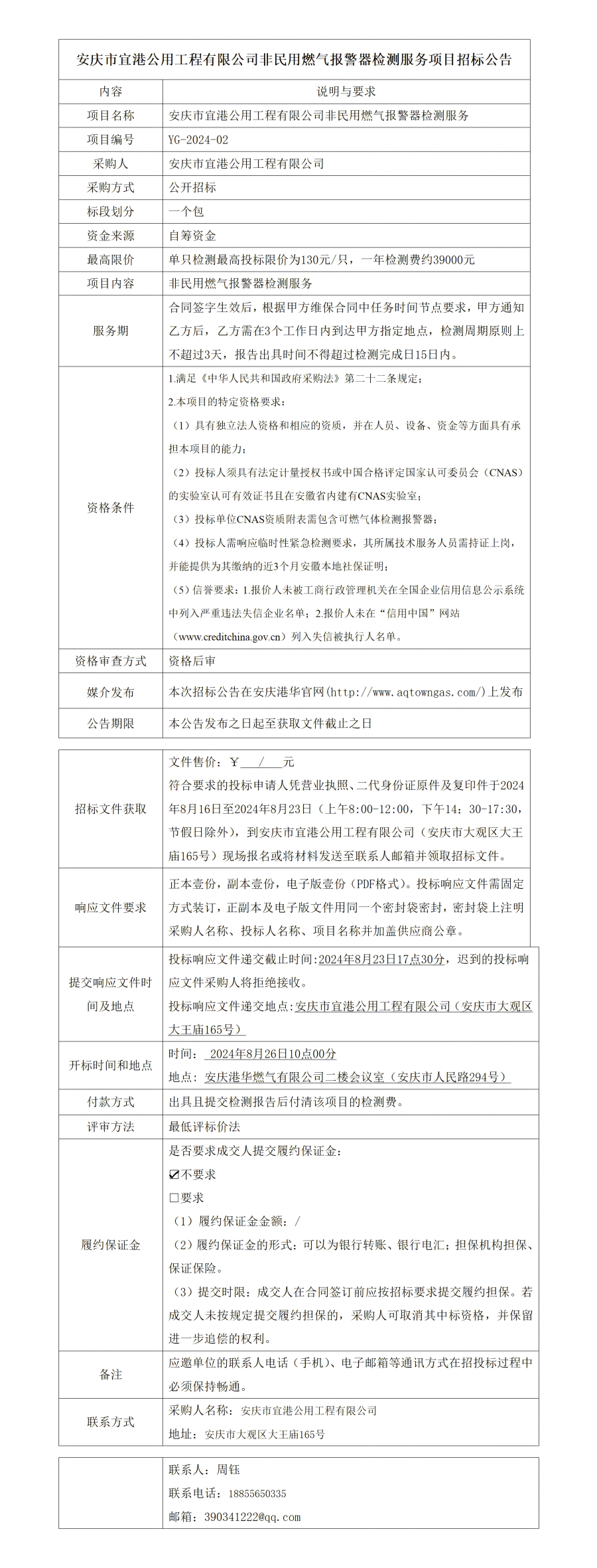 安慶市宜港公用工程有限公司非民用燃氣報警器檢測服務(wù)項目招標公告