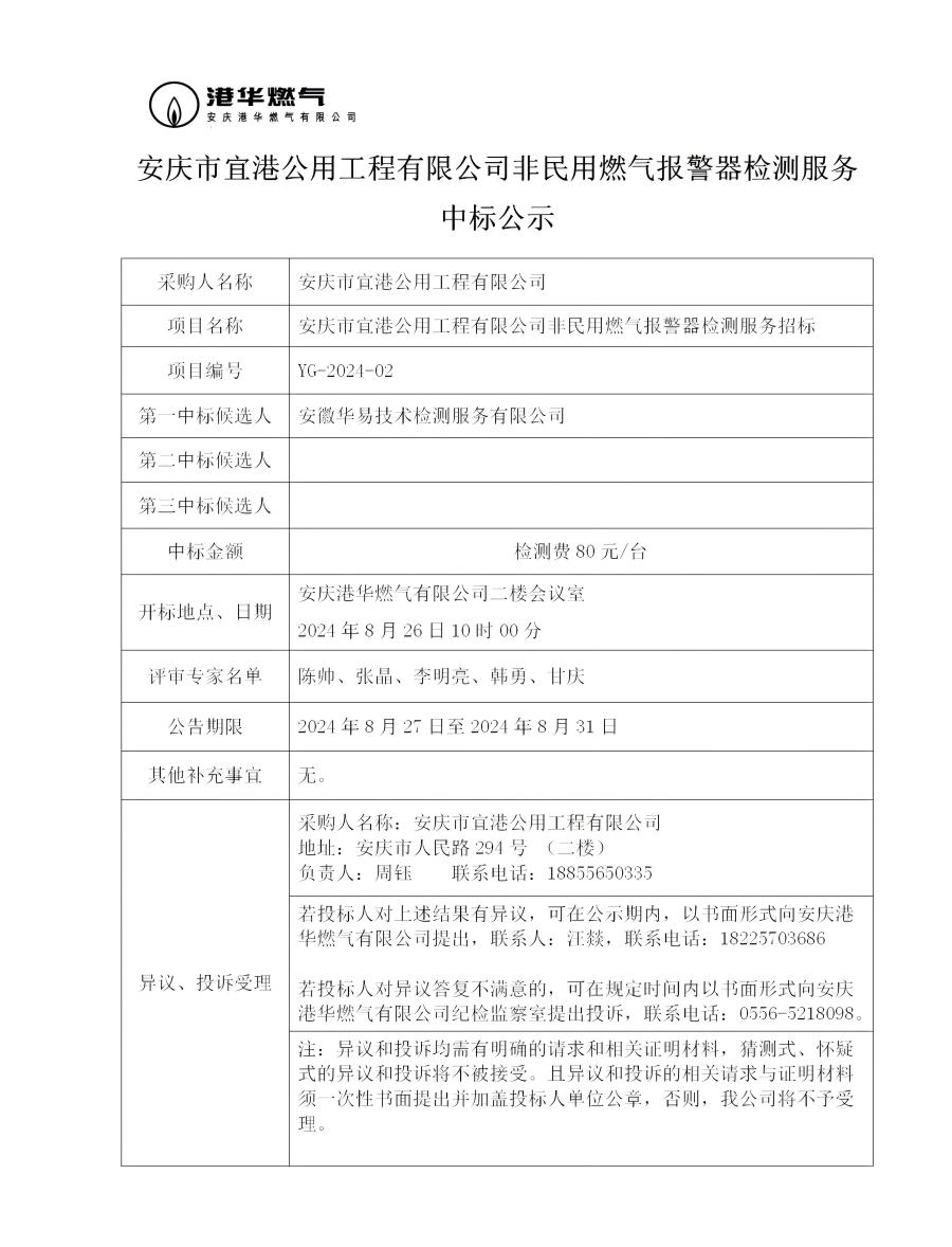 安慶市宜港公用工程有限公司非民用燃?xì)鈭缶鳈z測服務(wù)中標(biāo)公示