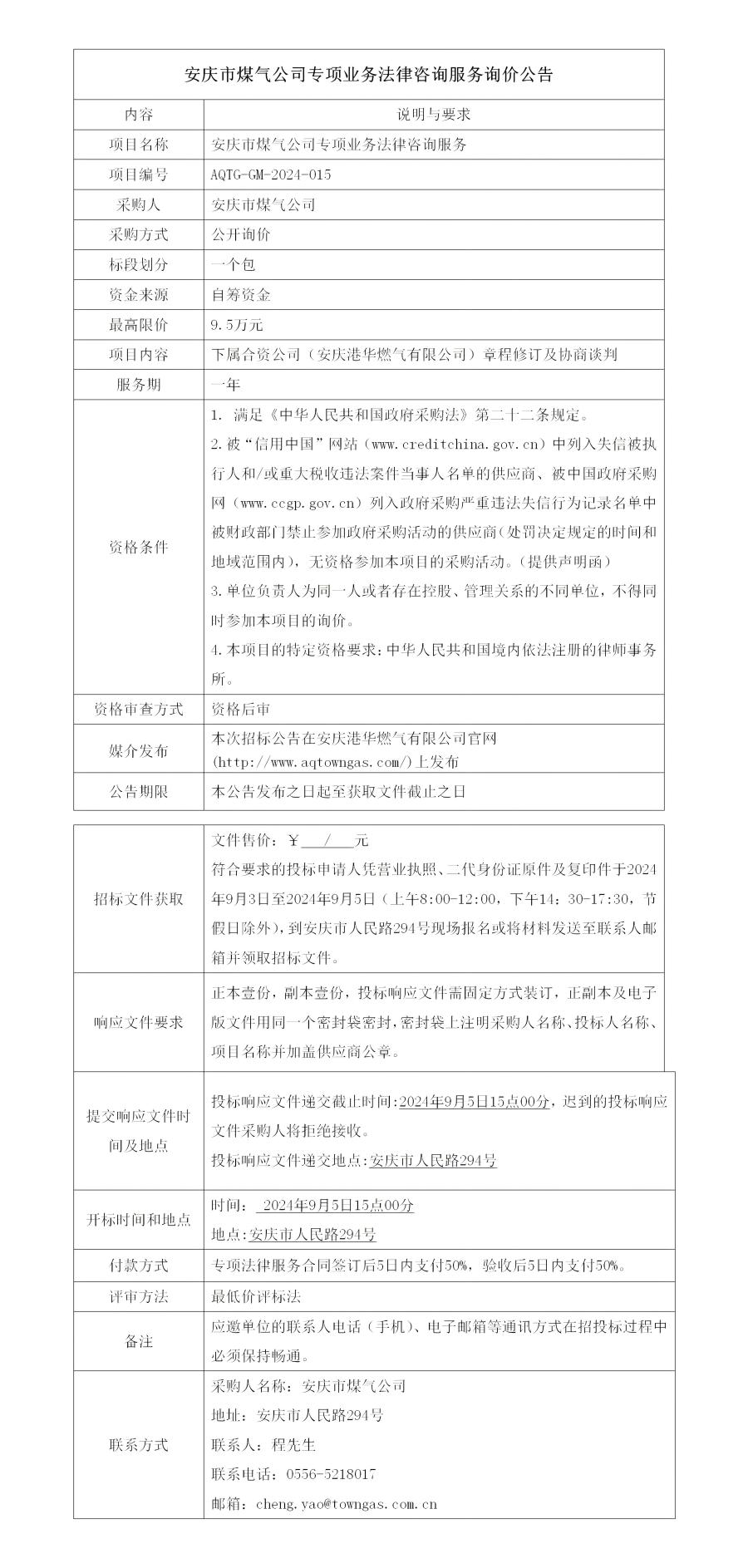 安慶市煤氣公司專項(xiàng)業(yè)務(wù)法律咨詢服務(wù)詢價(jià)公告