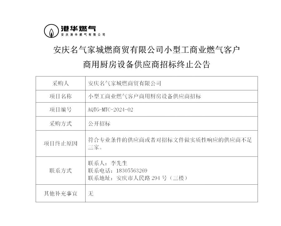 安慶名氣家城燃商貿(mào)有限公司小型工商業(yè)燃氣客戶商用廚房設(shè)備供應(yīng)商招標(biāo)終止公告
