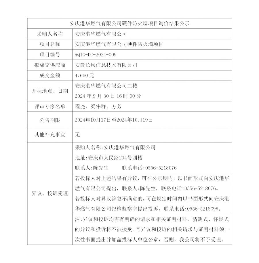 安慶港華燃?xì)庥邢薰居布阑饓?xiàng)目詢(xún)價(jià)結(jié)果公示