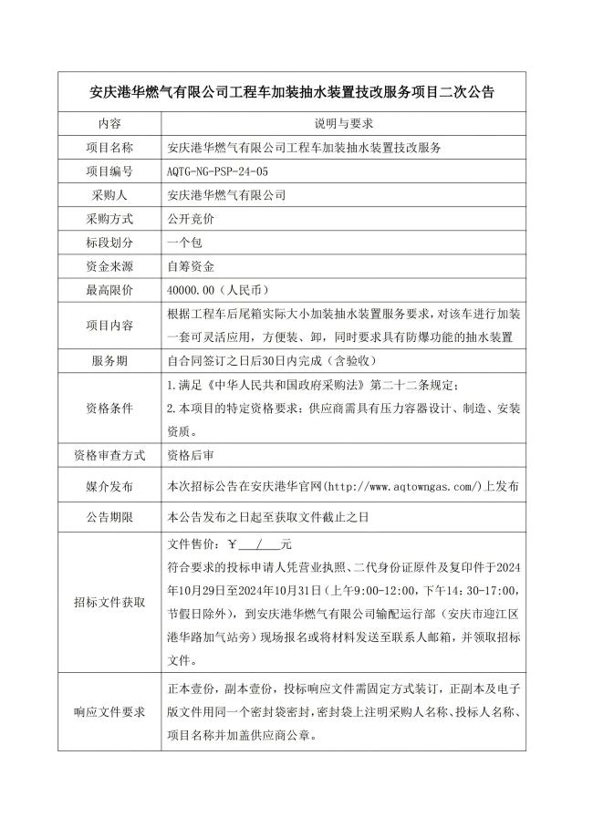 安慶港華燃?xì)庥邢薰竟こ誊?chē)加裝抽水裝置技改服務(wù)項(xiàng)目二次公告