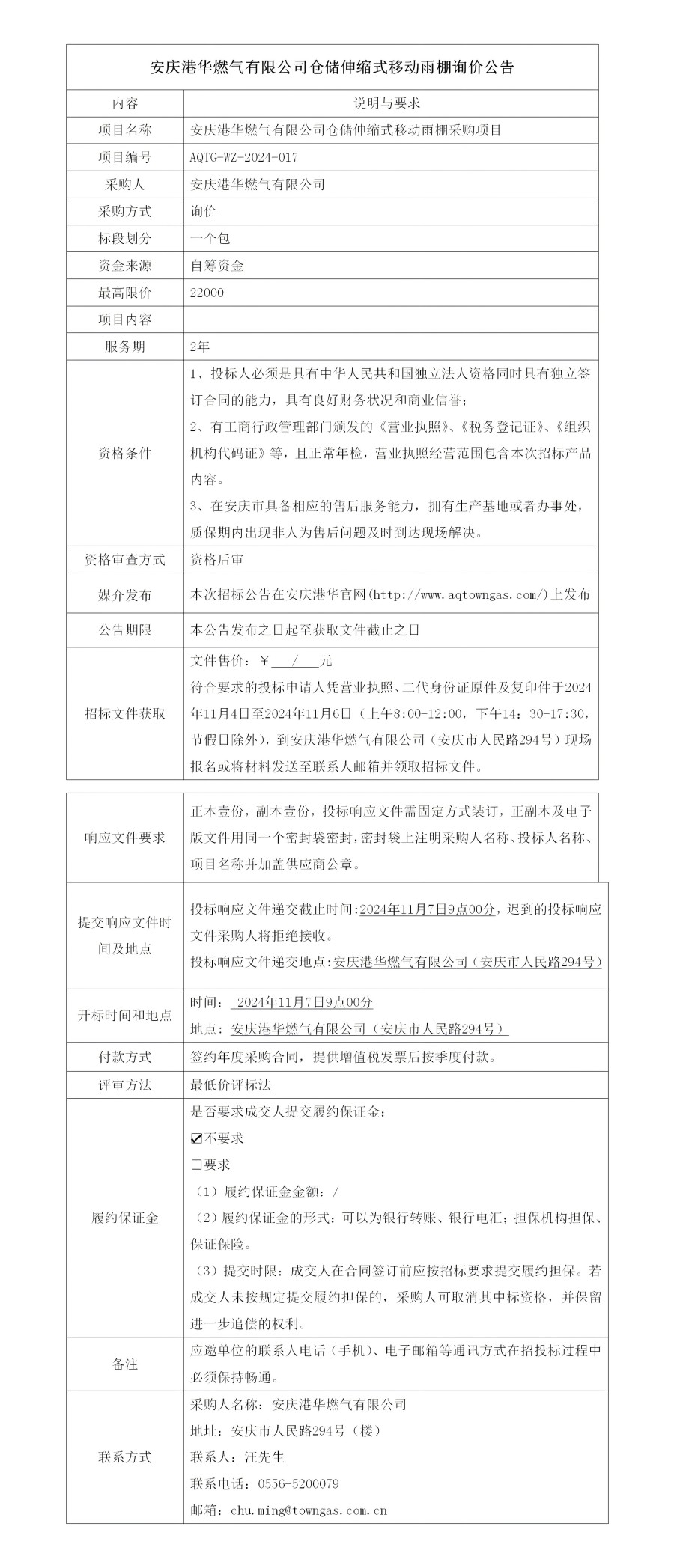 安慶港華燃?xì)庥邢薰緜}儲伸縮式移動雨棚詢價公告