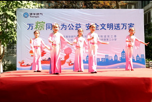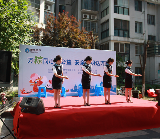 當(dāng)日,安慶港華的義工隊(duì)員和“藍(lán)焰”黨員義工們?cè)缭鐏?lái)到炮營(yíng)山社居委轄區(qū)的諧水灣小區(qū),撐帳篷,搭展臺(tái),搬物料,一場(chǎng)以“包粽子、看演出、講安全、傳文明”為主題的文化大餐陸續(xù)上演?;顒?dòng)現(xiàn)場(chǎng)熱鬧非凡,不少用戶正在港華燃?xì)獾摹傲鲃?dòng)服務(wù)車”前排隊(duì)進(jìn)行燃?xì)鈭?bào)裝和繳費(fèi),服務(wù)臺(tái)的工作人員一邊發(fā)放著燃?xì)獍踩麄魇謨?cè),一邊針對(duì)居民的用氣問(wèn)題耐心作答。而廣場(chǎng)正中央搭建的演出舞臺(tái)更是吸引不少居民駐足圍觀,安慶港華燃?xì)夂蜕鐓^(qū)居民聯(lián)合打造的精彩紛呈的文藝表演正在進(jìn)行。既有優(yōu)揚(yáng)的港華企業(yè)歌曲,又有優(yōu)雅的服務(wù)禮儀表演;社區(qū)阿姨們的廣場(chǎng)舞,舞出了歡樂(lè),舞出了自信,來(lái)自轄區(qū)學(xué)校孩子們有模有樣的黃梅戲表演,讓我們看到了傳統(tǒng)戲曲文化的美好傳承;穿插其間的燃?xì)獍踩R(shí)有獎(jiǎng)問(wèn)答更是引得眾人踴躍參與,掌聲、歡呼聲此起彼伏。而臺(tái)下社區(qū)阿姨和港華義工在欣賞精彩文藝演出的同時(shí),還不忘巧手裹粽,不多會(huì),桌上就擺滿了幾百只飄著粽葉香的愛(ài)心粽,既弘揚(yáng)了傳統(tǒng)文化,又增進(jìn)了企業(yè)和居民之間的感情,現(xiàn)場(chǎng)呈現(xiàn)出一片文明和諧,奮進(jìn)向上的氛圍。